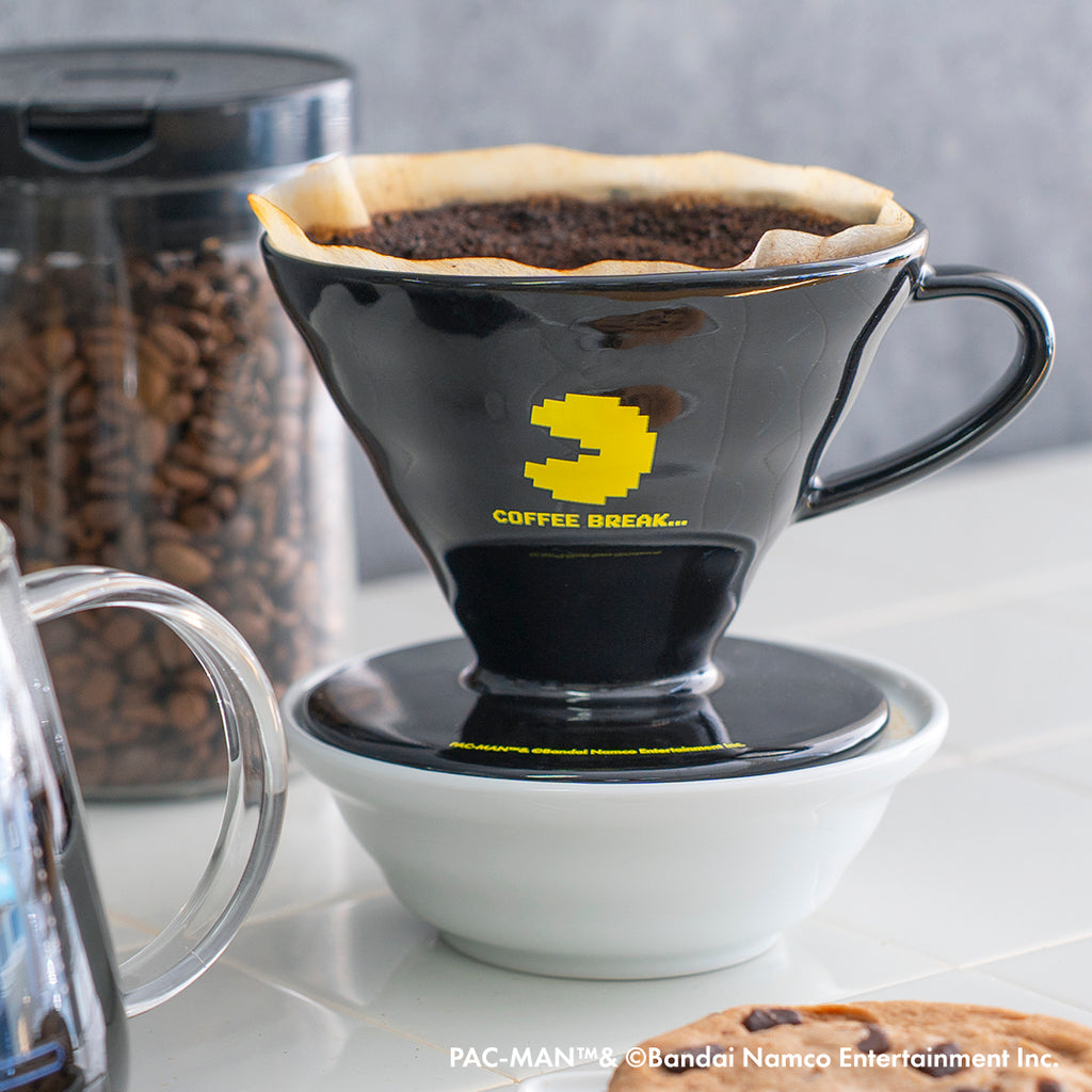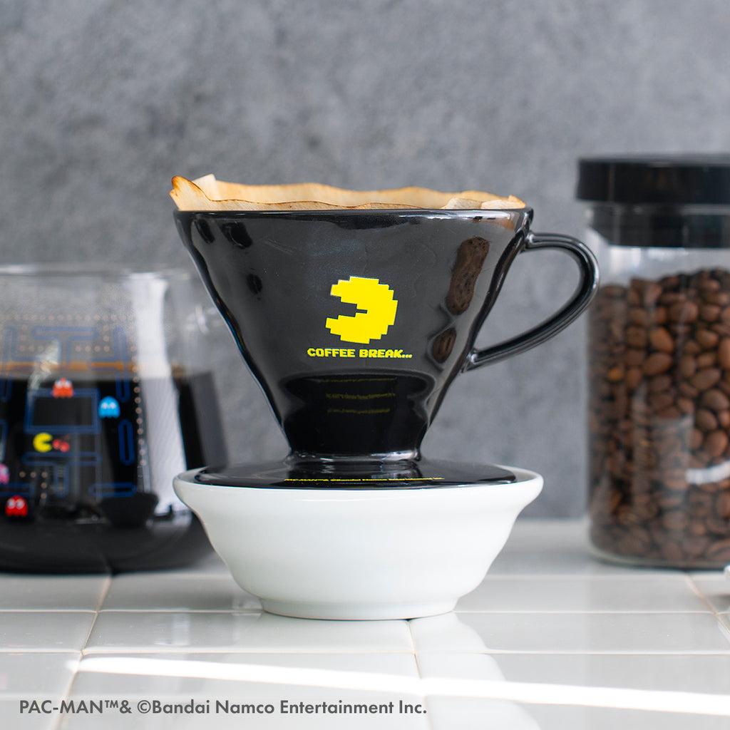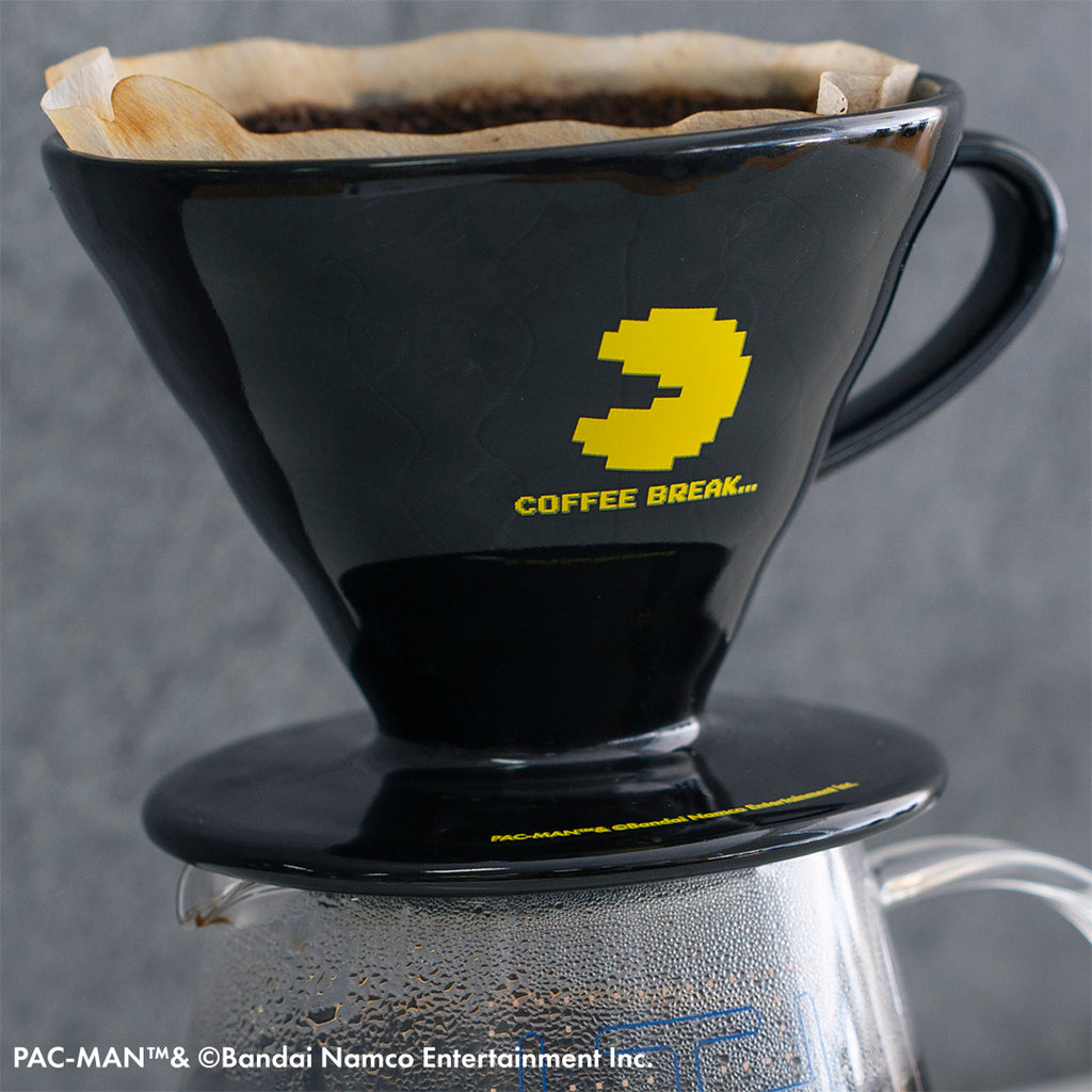 ドリッパーは、黒の磁器に「パックマン」「COFFEE BREAK…」をプリント。