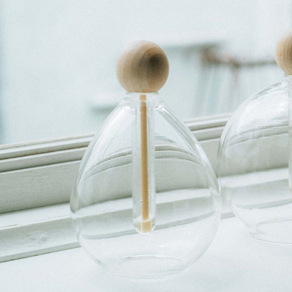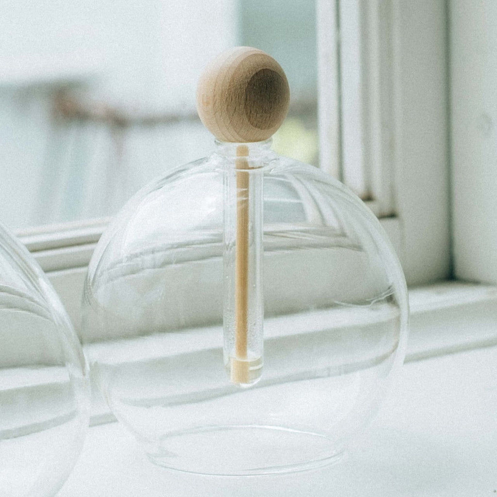 ガラス管の中にアロマオイルを⼊れて、⽊製スティックをセットし、