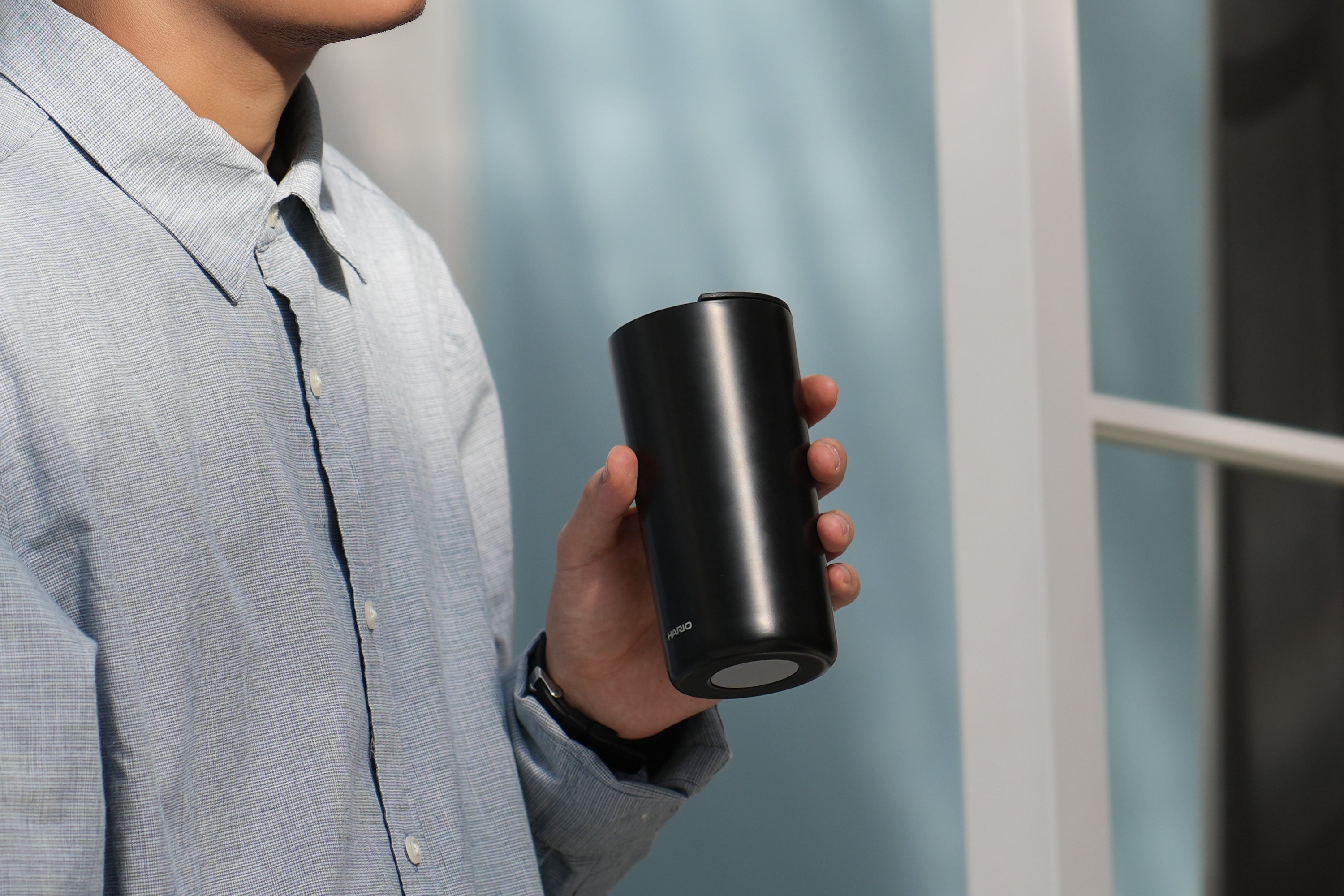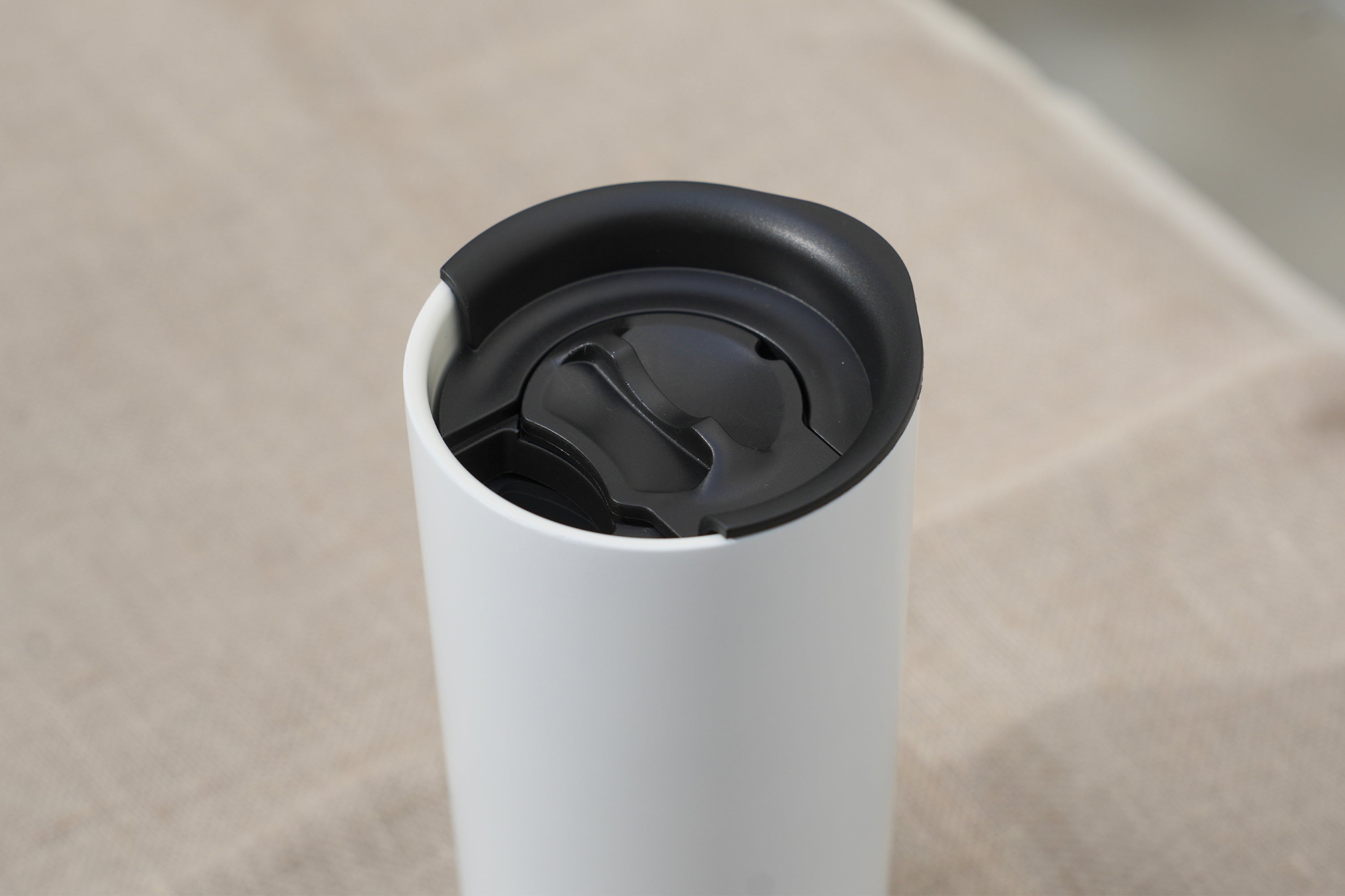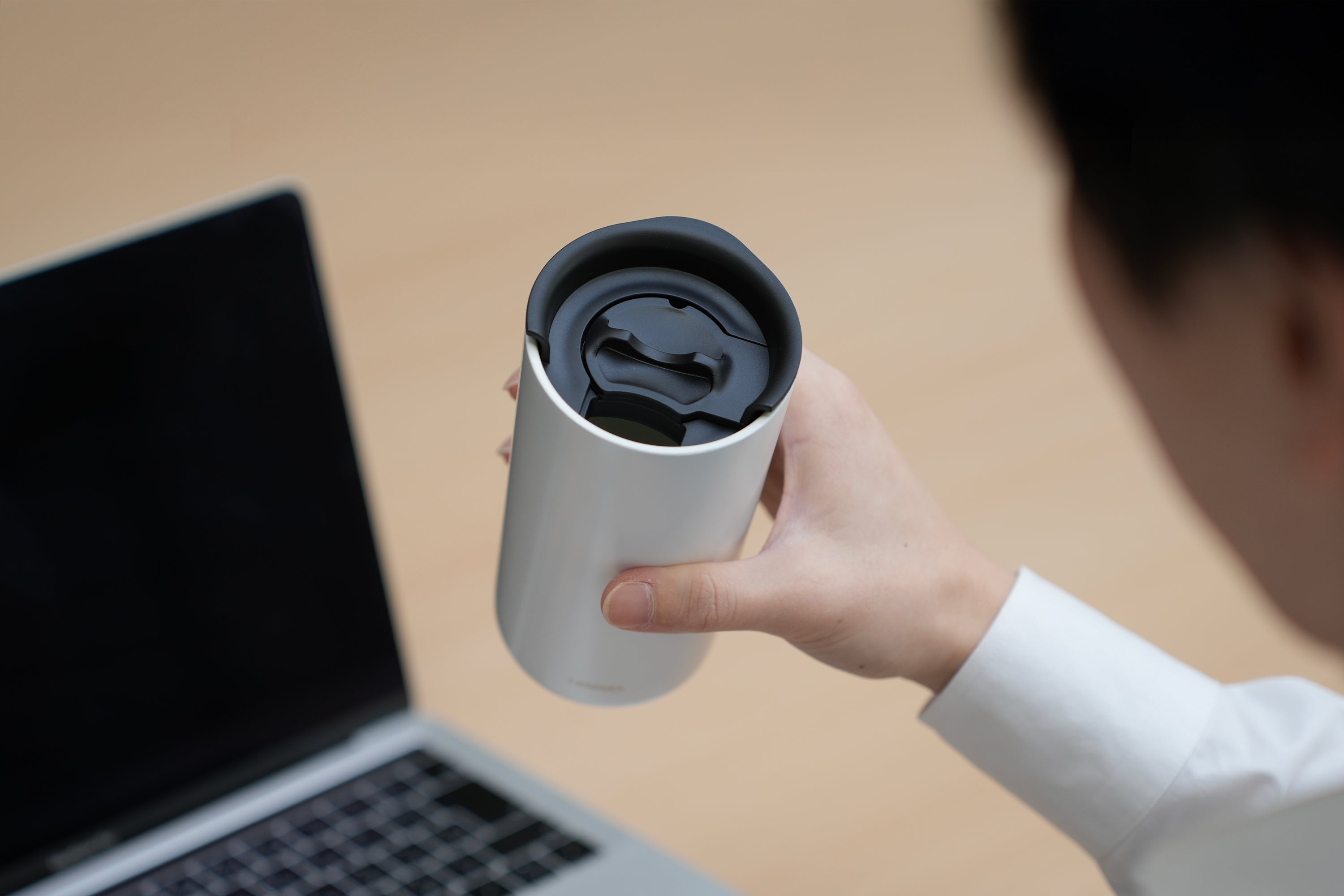 フタはツマミを回すだけで簡単に開閉できます。 飲む際はマグ本体に直接口を付けて飲める設計です。 樹脂フタ特有の厚みのある口当たりを抑え、マグカップのような自然でなめらかな飲み心地を実現しました。