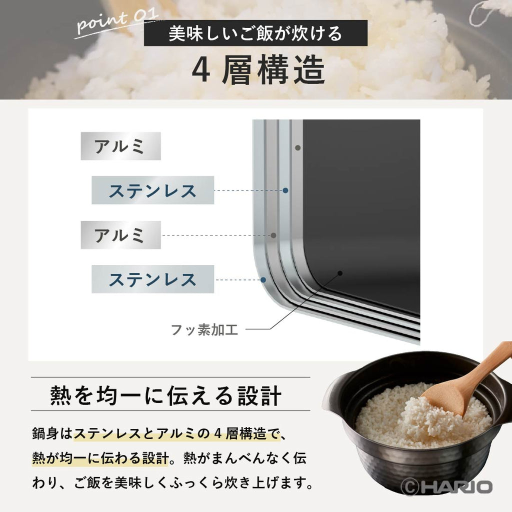 ステンレスとアルミの4層構造の鍋身は熱をまんべんなく伝え、ご飯を美味しく炊き上げます。内面にはフッ素コートを施してあるので、ご飯がこびりつきにくくなっています。ご飯以外に煮込み料理にもお使いいただけます。