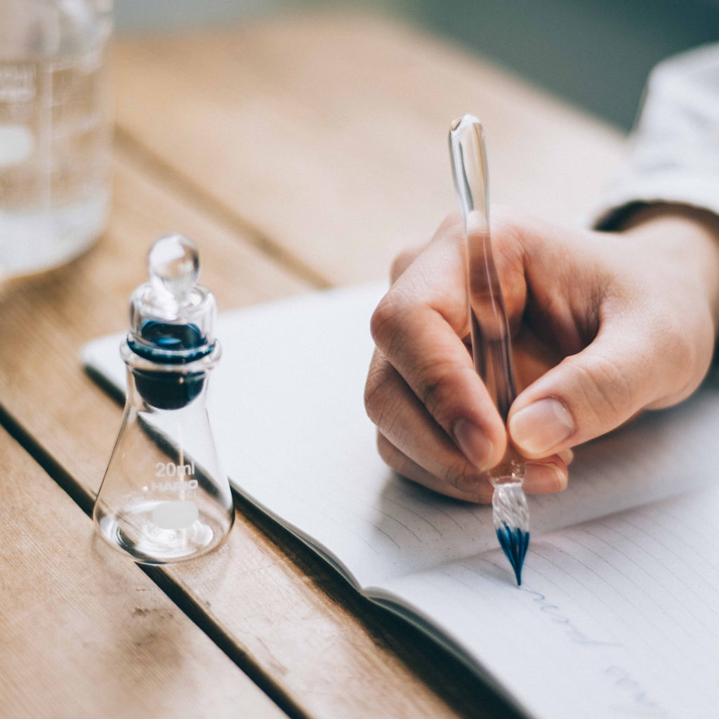 ペン先がガラスに当たらないようにそっとガラスペンを受皿に挿し込んでください。