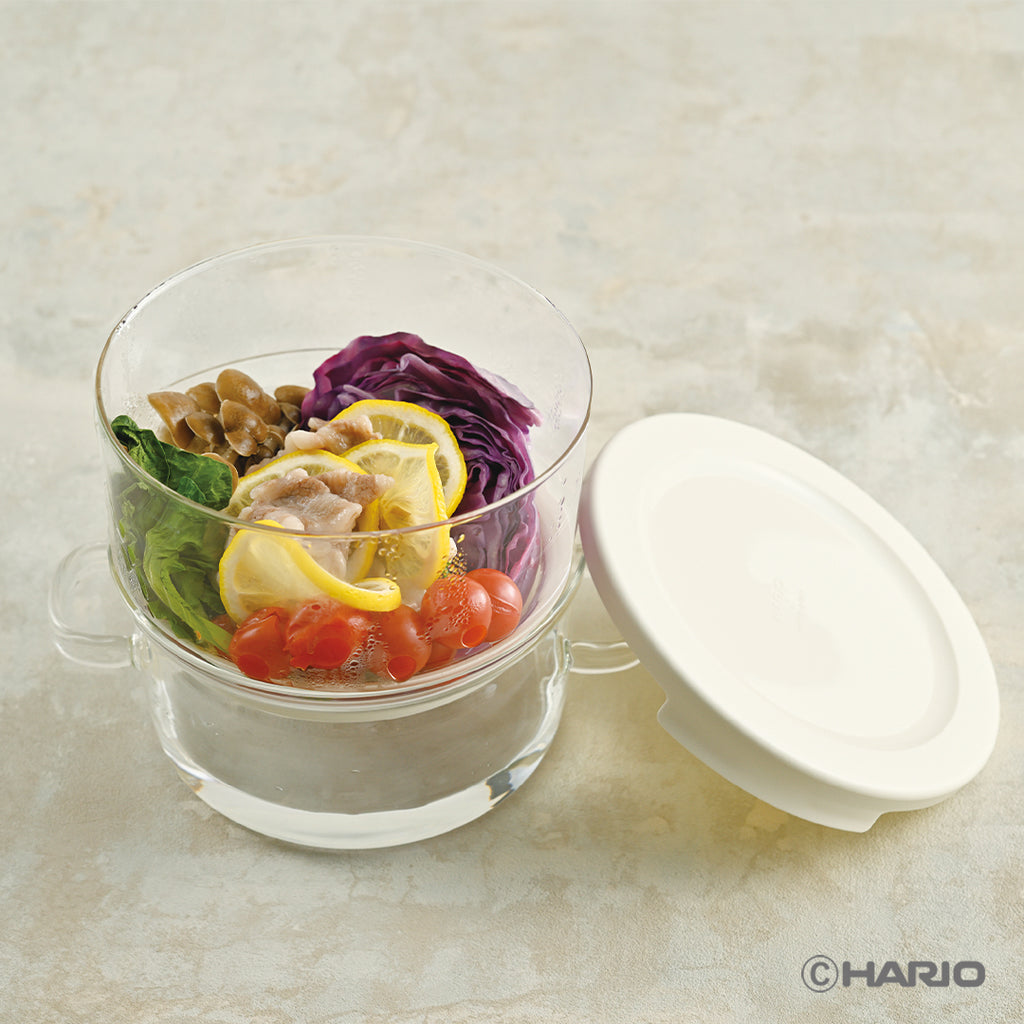 二段構造になっており上下ともに耐熱ガラスなので、電子レンジで一度に2つの調理が同時に作れます。上ボールには4つの穴が開いているので、下段の蒸気で上段を蒸し上げることができます。
