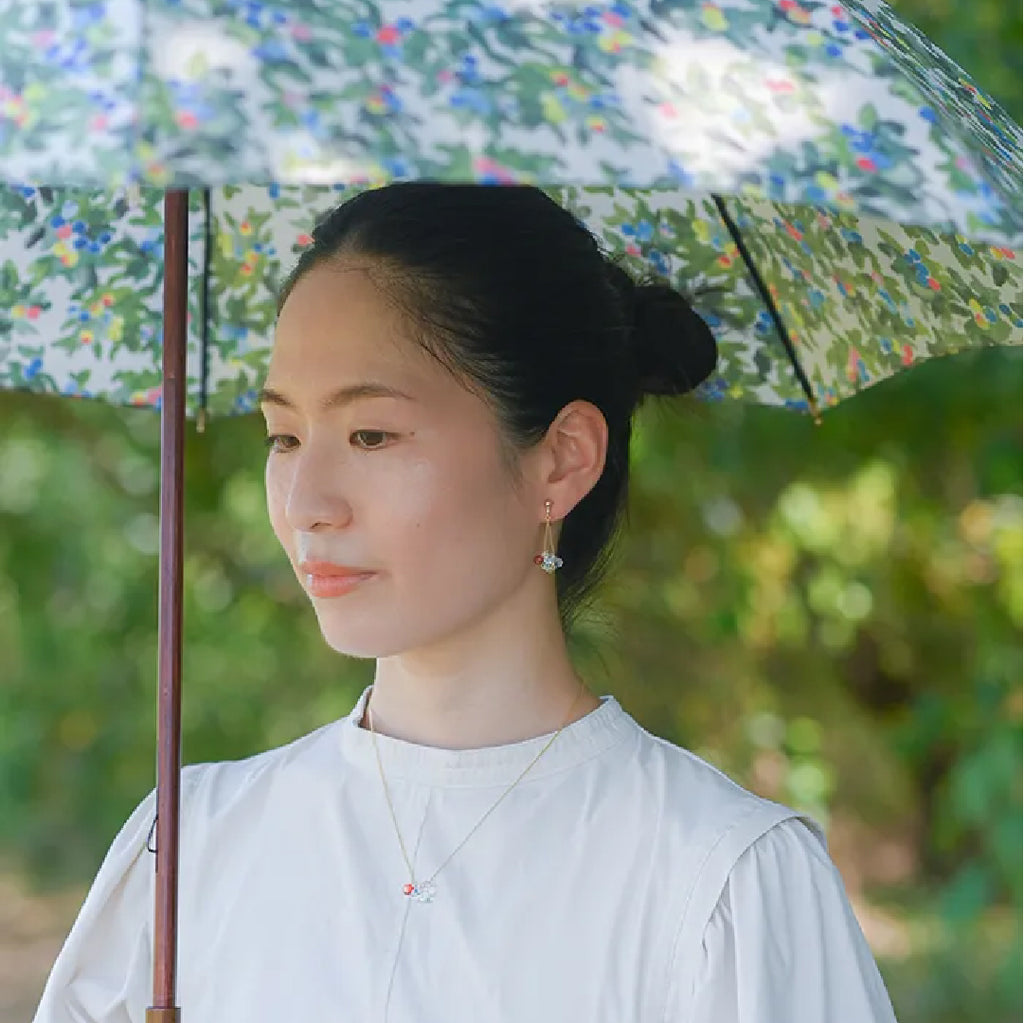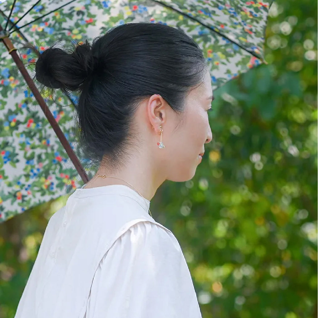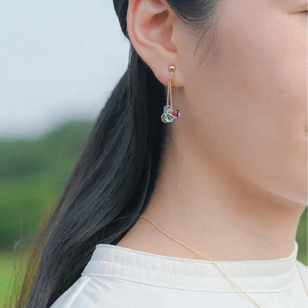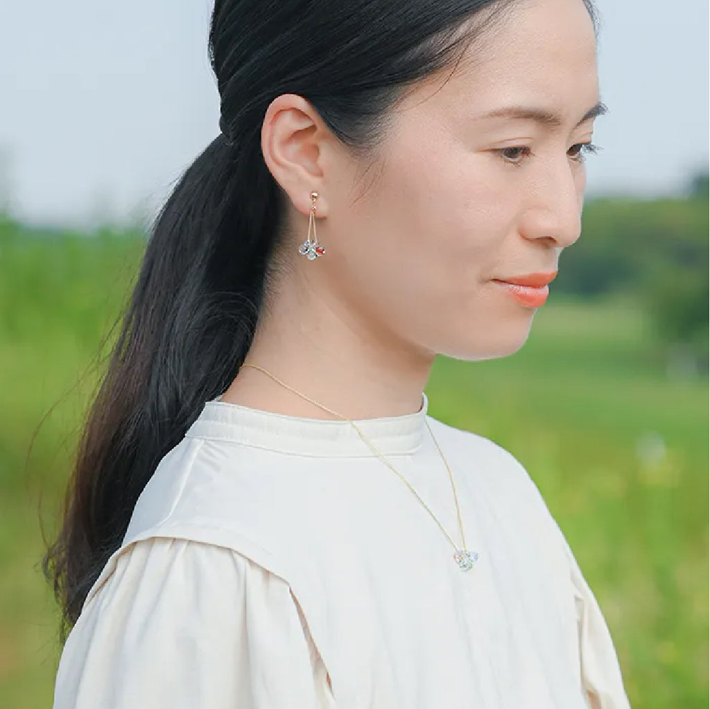 イイダ傘店の繊細で鮮やかなテキスタイルをガラスで表現した、生き生きと輝くガラスのアクセサリー。
