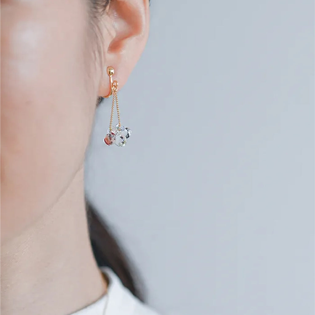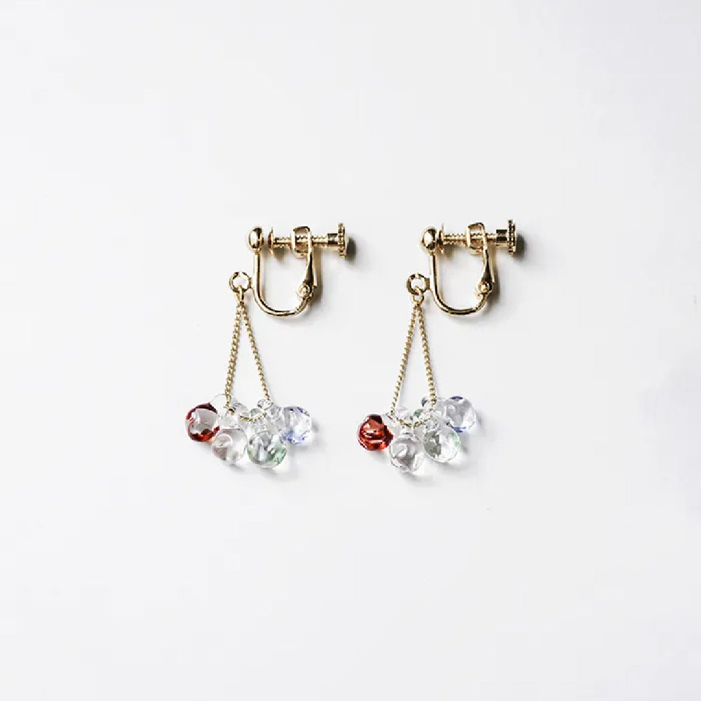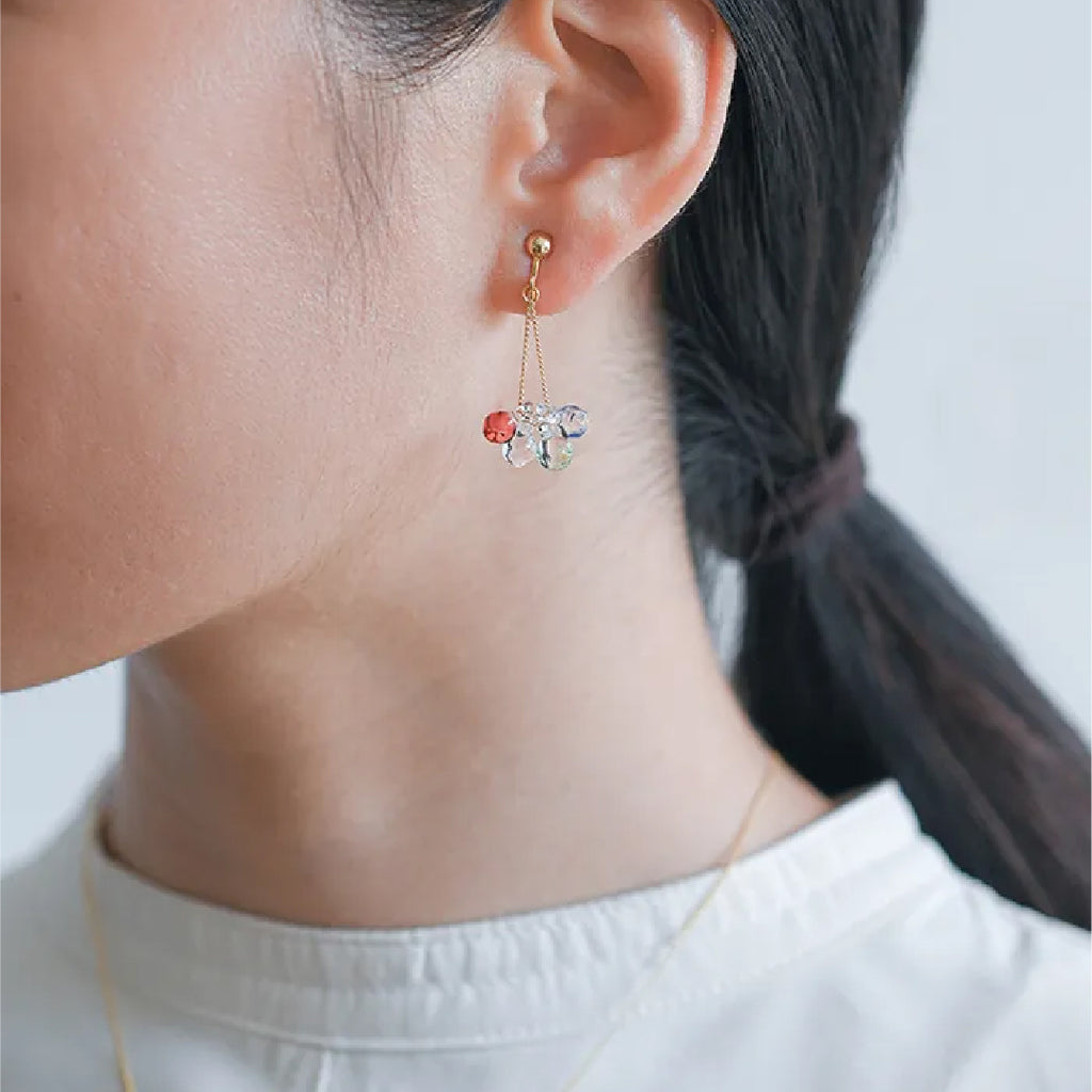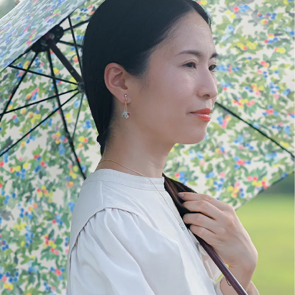 イイダ傘店の繊細で鮮やかなテキスタイルをガラスで表現した、生き生きと輝くガラスのアクセサリー。