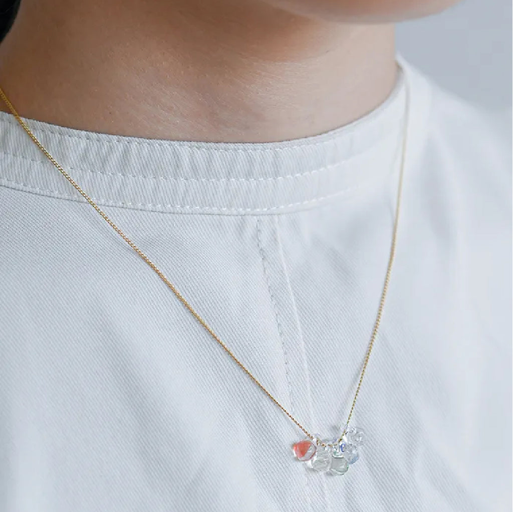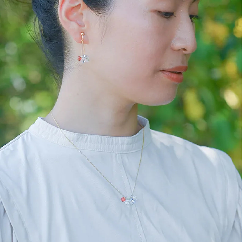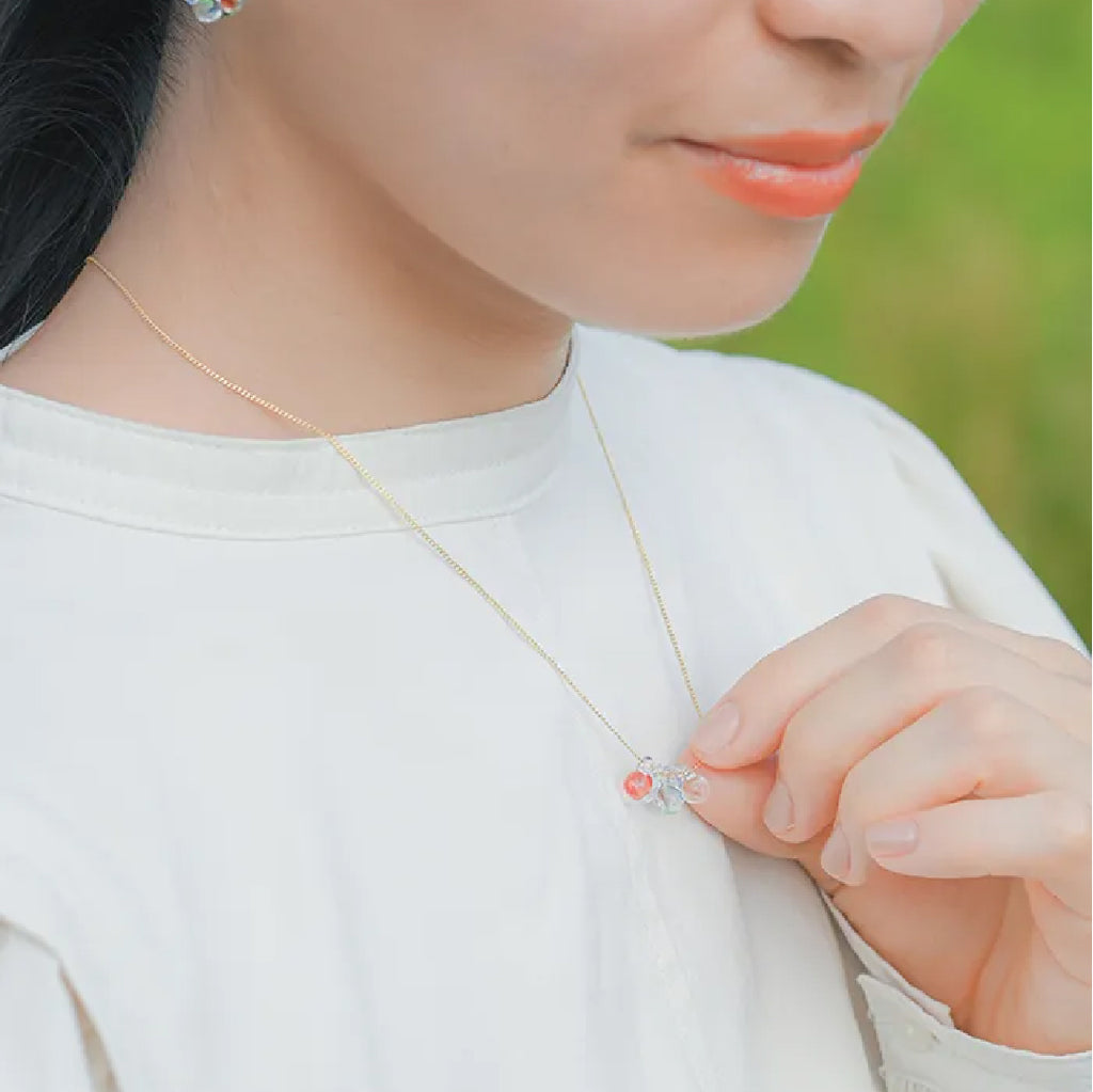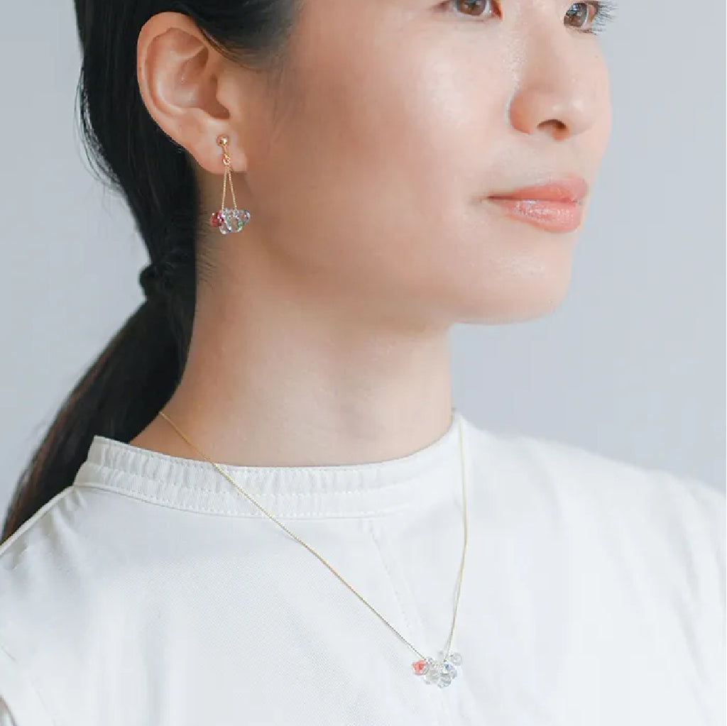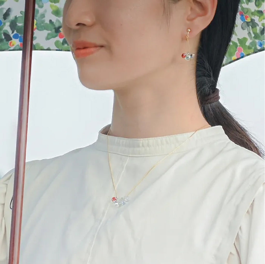 イイダ傘店の繊細で鮮やかなテキスタイルをガラスで表現した、生き生きと輝くガラスのアクセサリー。