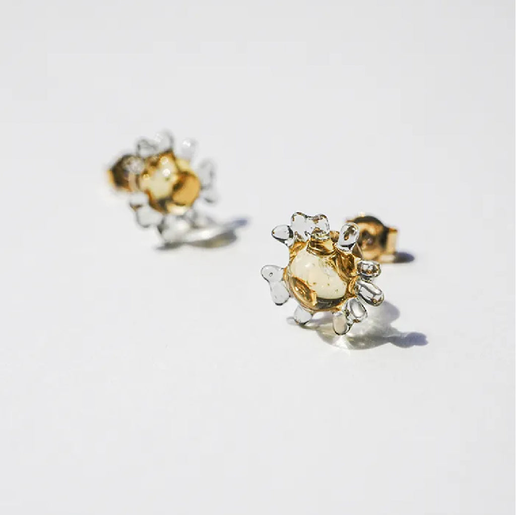 イイダ傘店の繊細で鮮やかなテキスタイルをガラスで表現した、生き生きと輝くガラスのアクセサリー。