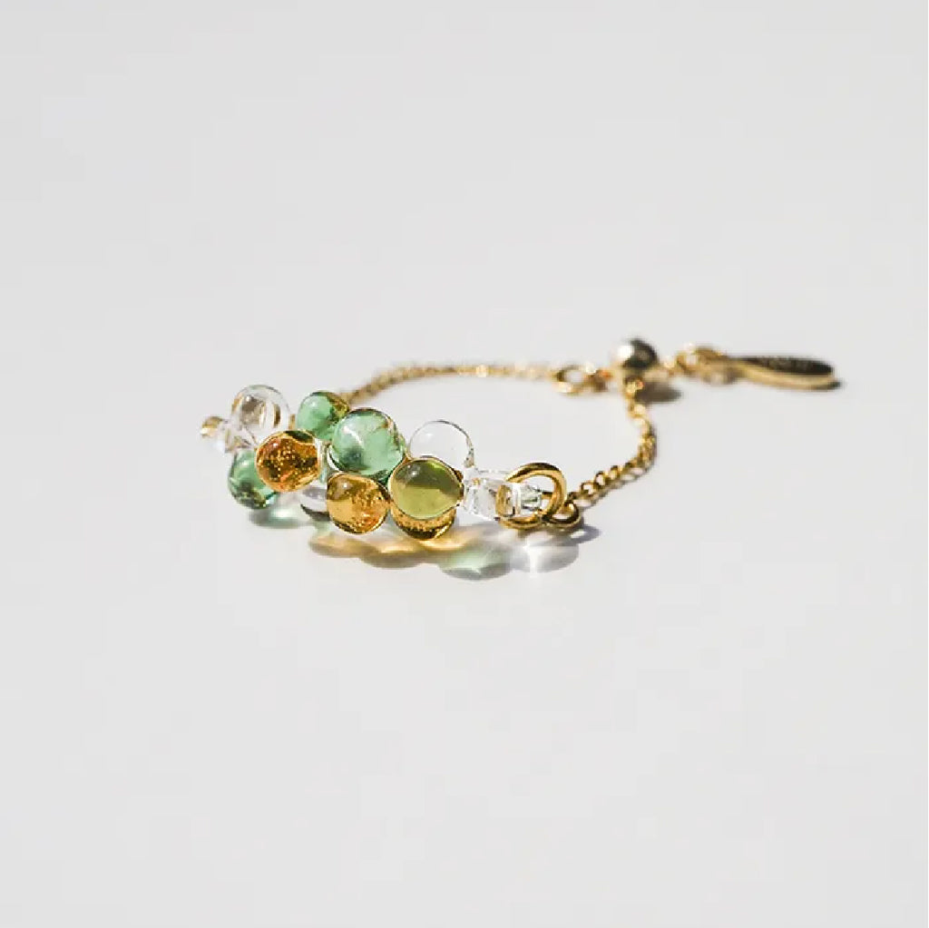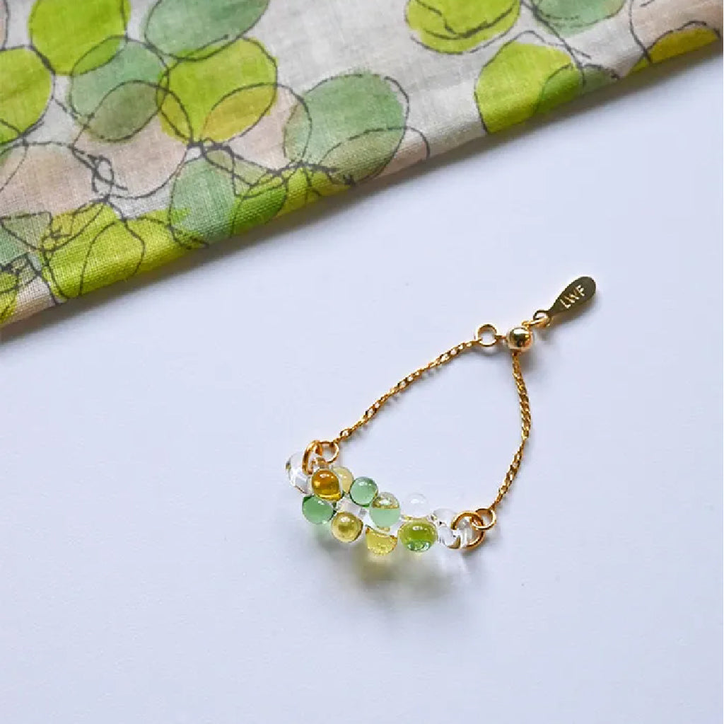 イイダ傘店の繊細で鮮やかなテキスタイルをガラスで表現した、生き生きと輝くガラスのアクセサリー。